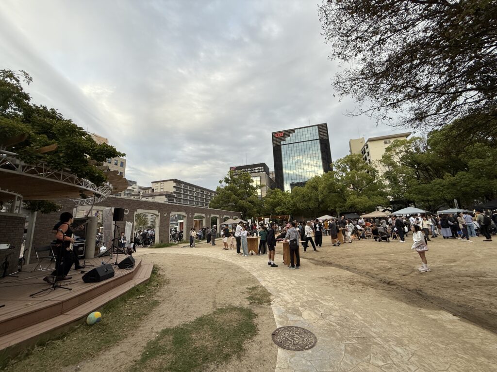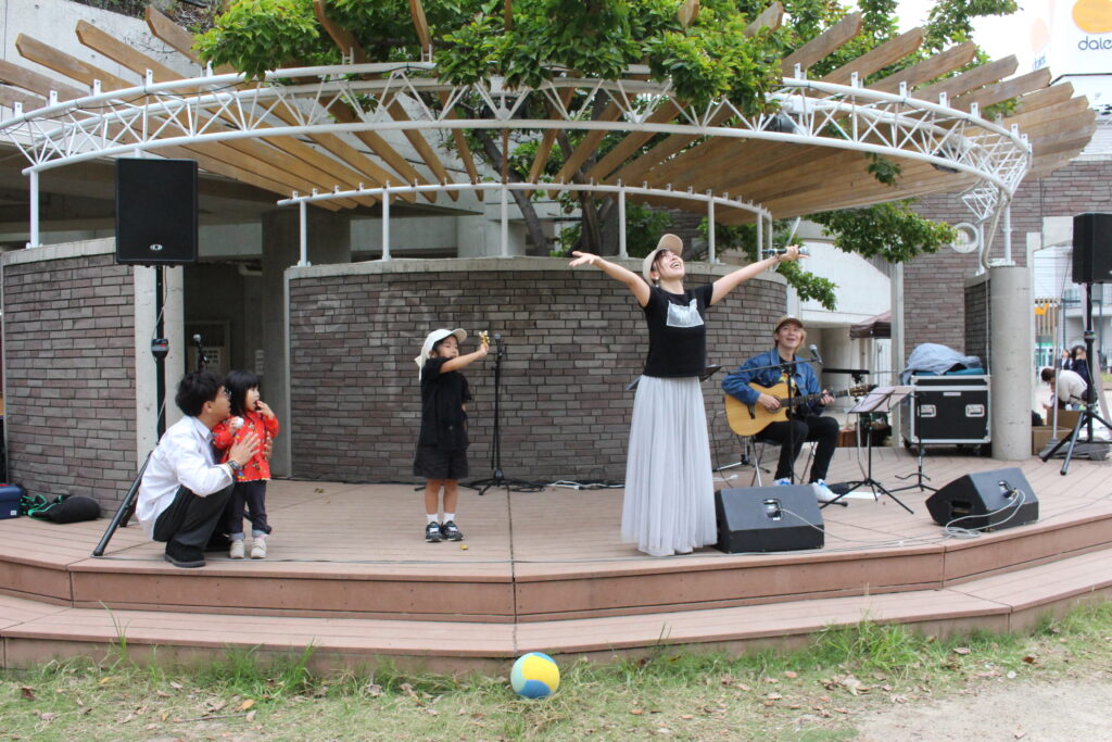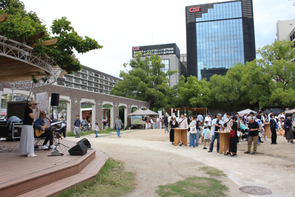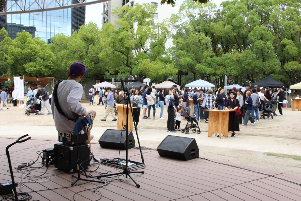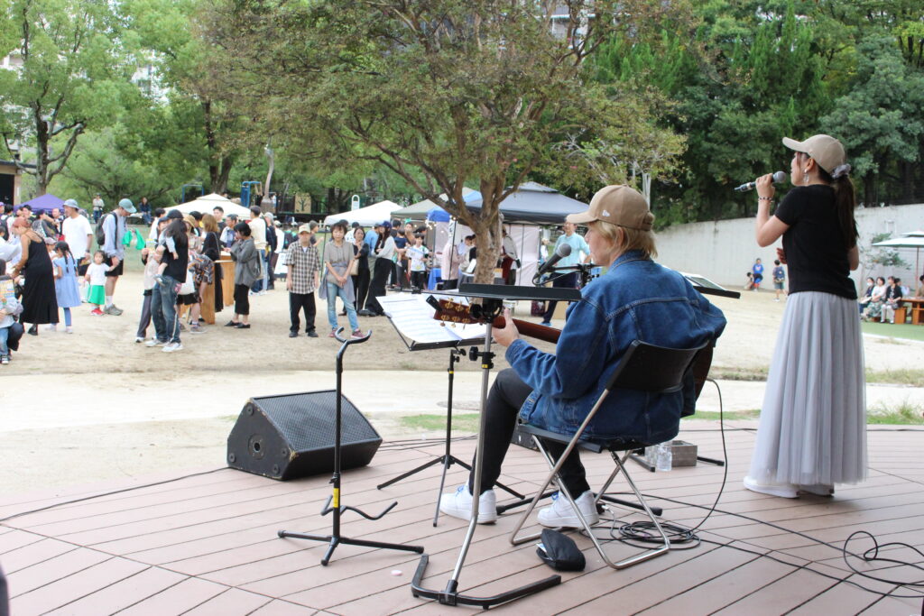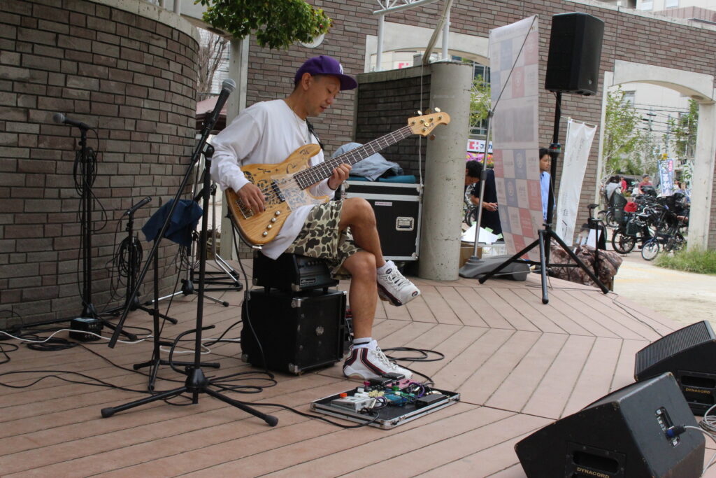 少し雲が広がる空の下、江坂公園には多くのブースが軒を連ね、15:00の開始を待ちわびた人々の列ができていました。開会宣言と同時に、ESAKAミュージックストリートが始動。一番手として登場したのは、本イベントにお馴染みのベーシスト、正垣雄治さんです。オープニングミュージックとして響き渡る彼の音楽は、訪れる人々を優しく包み込み、道行く人々をも会場へと引き込む魅力的な旋律を奏でてくれました。